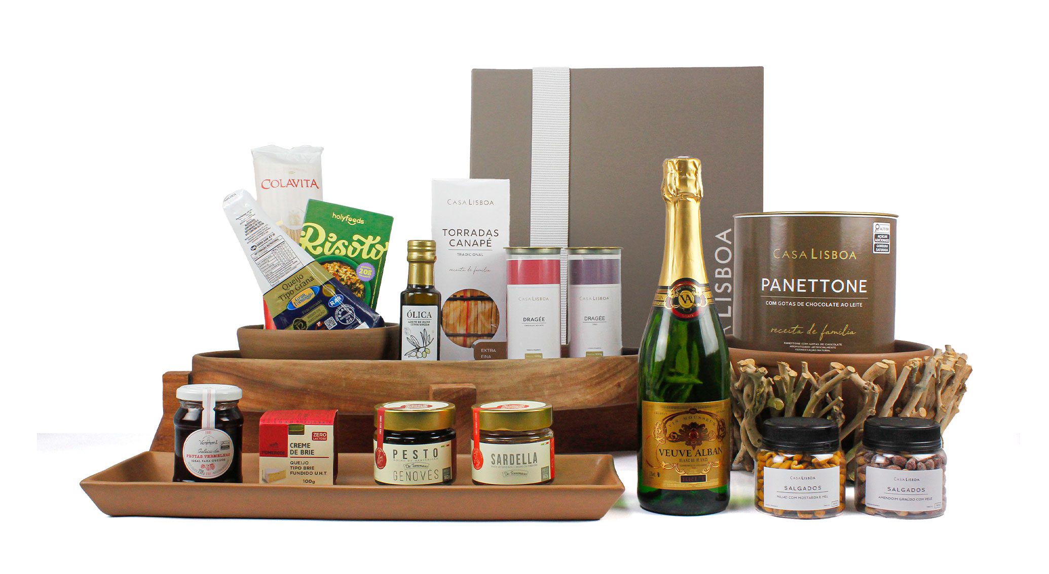 | ESPUMANTE FRANCÊS VEUVE ALBAN BRUT PANETTONE GOTAS DE CHOCOLATE CASA LISBOA DRAGEE DE CHOCOLATE AO LEITE CASA LISBOA DRAGEE DE OREO CASA LISBOA AZEITE EXTRA VIRGEM ARGENTINO OLICA RISOTO DE FUNGHI NACIONAL HOLYFOODS MASSA ITALIANA SPAGHETTI COLAVITA MOLHO PESTO GENOVES DE TOMMASO QUEIJO GRANA PADANO GRAN MESTRI TORRADAS EXTRA FINA CASA LISBOA SARDELA DE TOMMASO CREME DE BRIE POMERODE GELEIA NACIONAL DE FRUTAS VERMELHAS VERMONT MILHO COM MOSTARDA E MEL CASA LISBOA AMENDOIM TORRADO E SALGADO CASA LISBOA CAIXA DE PAPEL RÍGIDO DECORADA |