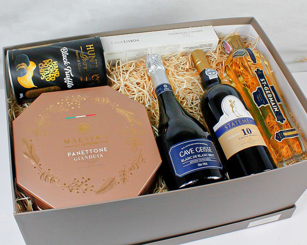| ESPUMANTE NACIONAL CAVE GEISSE BLANC DE BLANC VINHO DO PORTO STATEMENT 10 ANOS LICOR FRANCÊS SAINT GERMAIN VINHO PORTUGUÊS ALBARRADA DOC RESERVA BRANCO VINHO ITALIANO ROSSO DE MONTALCINO CAPARZO PANETONE ITALIANO GIANDUIA MAESTRA CUBOS DE CHOCOTTONE COB C/ CHOCOLATE CASA LISBOA DRAGEE DE CHOCOLATE AO LEITE CASA LISBOA DRAGEE DE OREO CASA LISBOA MASSA ITALIANA TAGLIATELE GRAGANARO MOLHO PESTO GENOVES DE TOMMASO AZEITE EXTRA VIRGEM VERDE LOURO POTATO CHIPS BLACK TRUFFLE HUNTERS TORRADAS EXTRA FINA CASA LISBOA SARDELA DE TOMMASO PASTA DE ALCACHOFRA DE TOMMASO QUEIJO PETIT BRIE FRANCÊS ILE DE FRANCE GELÉIA NACIONAL DE PIMENTA VERMONT AMENDOIM TORRADO E SALGADO CASA LISBOA MILHO COM MOSTARDA E MEL CASA LISBOA MIX NUTS SALGADO CASA LISBOA CAIXA DE PAPEL RÍGIDO DECORADA |