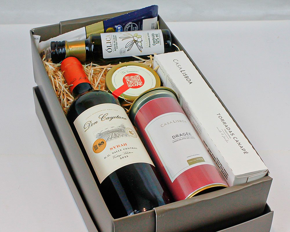 | VINHO CHILENO DON CAYETANO CHARDONNAY DRAGEE DE CHOCOLATE AO LEITE CASA LISBOA RISOTO DE FUNGHI NACIONAL HOLYFOODS AZEITE EXTRA VIRGEM ARGENTINO OLICA TORRADAS EXTRA FINA CASA LISBOA CREME DE BRIE POMERODE GELÉIA NACIONAL DE PIMENTA VERMONT SACHE DE MIX NUTS CASA LISBOA CAIXA DE PAPEL RÍGIDO DECORADA |