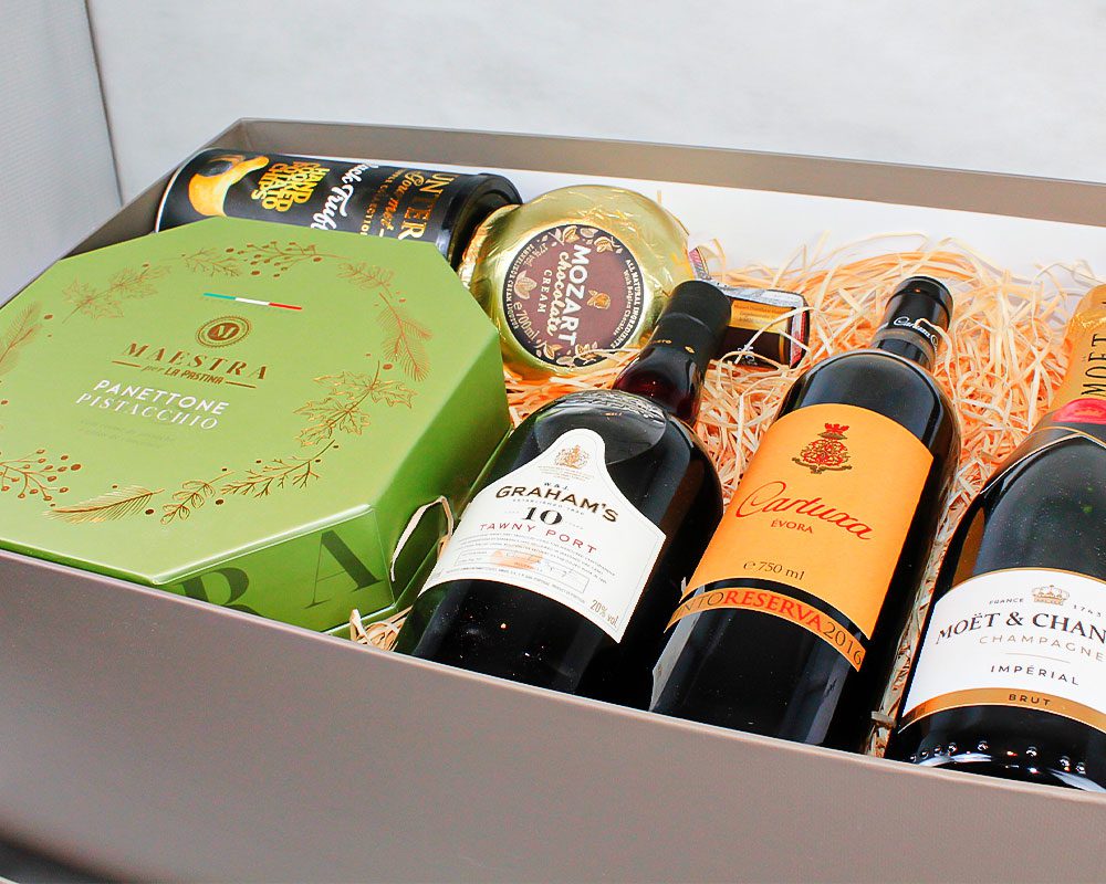 | CHAMPAGNE FRANCÊS MOET CHANDON BRUT VINHO DO PORTO GRAHM S 10 ANOS LICOR BELGA CHOCOLATE MOZART VINHO FRANCÊS BOURGOGNE LAUIS JADOT VINHO PORTUGUÊS CARTUXA RESERVA PANETONE ITALIANO PISTACHE MAESTRA CUBOS DE CHOCOTTONE COB C/ CHOCOLATE CASA LISBOA DRAGEE DE CHOCOLATE AO LEITE CASA LISBOA DRAGEE DE OREO CASA LISBOA MASSA ITALIANA TAGLIATELE GRAGANARO MOLHO PESTO GENOVES DE TOMMASO AZEITE EXTRA VIRGEM VERDE LOURO POTATO CHIPS BLACK TRUFFLE HUNTERS TORRADAS EXTRA FINA CASA LISBOA SARDELA DE TOMMASO PASTA DE ALCACHOFRA DE TOMMASO QUEIJO PETIT BRIE FRANCÊS ILE DE FRANCE GELÉIA NACIONAL DE PIMENTA VERMONT AMENDOIM TORRADO E SALGADO CASA LISBOA MILHO COM MOSTARDA E MEL CASA LISBOA MIX NUTS SALGADO CASA LISBOA CAIXA DE PAPEL RÍGIDO DECORADA |
