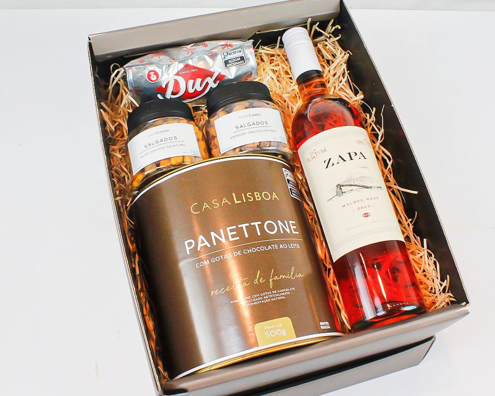 | VINHO ARGENTINO ZAPA MALBEC ROSE PANETTONE GOTAS DE CHOCOLATE CASA LISBOA BISCOITO AMANTEIGADO COLOMBIANO NATALINO DUX AMENDOIM TORRADO E SALGADO CASA LISBOA MILHO COM MOSTARDA E MEL CASA LISBOA CAIXA DE PAPEL RÍGIDO DECORADA |