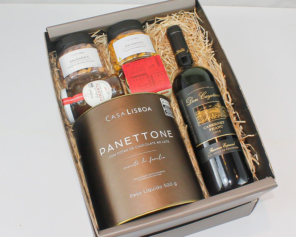 | VINHO CHILENO DON CAYETANO RESERVA CAB FRANC PANETTONE GOTAS DE CHOCOLATE CASA LISBOA TORRADAS EXTRA FINA CASA LISBOA CREME DE BRIE POMERODE GELÉIA NACIONAL DE PIMENTA VERMONT AMENDOIM TORRADO E SALGADO CASA LISBOA MILHO COM MOSTARDA E MEL CASA LISBOA CAIXA DE PAPEL RÍGIDO DECORADA |